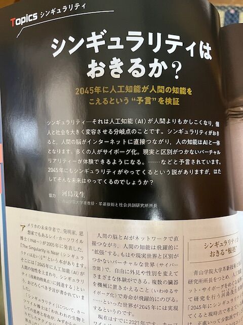 Singularity自体は特異点という意味であり、ペンローズとホーキングのブラックホールに関する特異点定理がその例である。しかし、この書で使うSingularityは上の画像のように、AIがヒトの頭脳を超えるという趣旨で使用されている