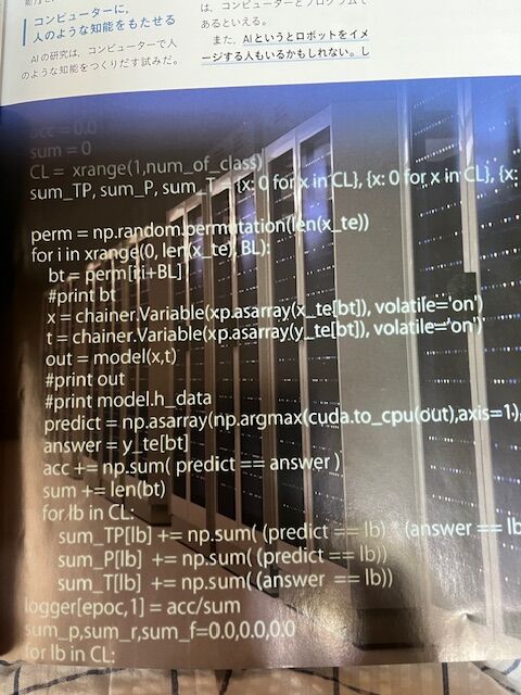 AIの実際のコード例の極く一部が画像化されている。DNAが日本人ではないソフトバンクグループの総帥は、AIがヒトの脳を超えると信仰しているようである。しかし、現時点では、そのような完全に汎用のAIは概念上のものに過ぎず近い将来には起こりえないと多くの者が見做しているようだ。