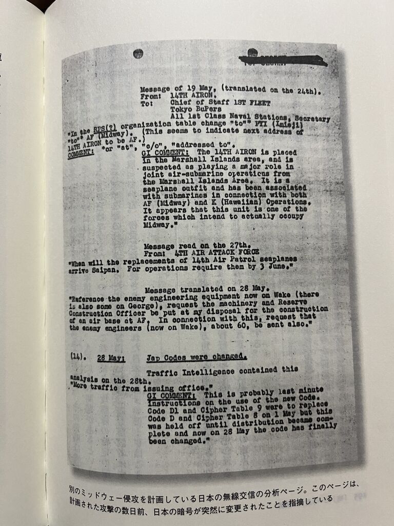 当たり前だか、暗号書さえあれば、後は、バカでもチョンでも解読できる。沈没した潜水艦から暗号書をアメリカが回収したことは知っているが、ひょっとしたら浅い海域で沈没した艦船からも暗号書を回収していたのかもしれない。万一、そのとおりであれば、第二次世界大戦の海軍暗号関連の歴史が、ガラッと変わる。