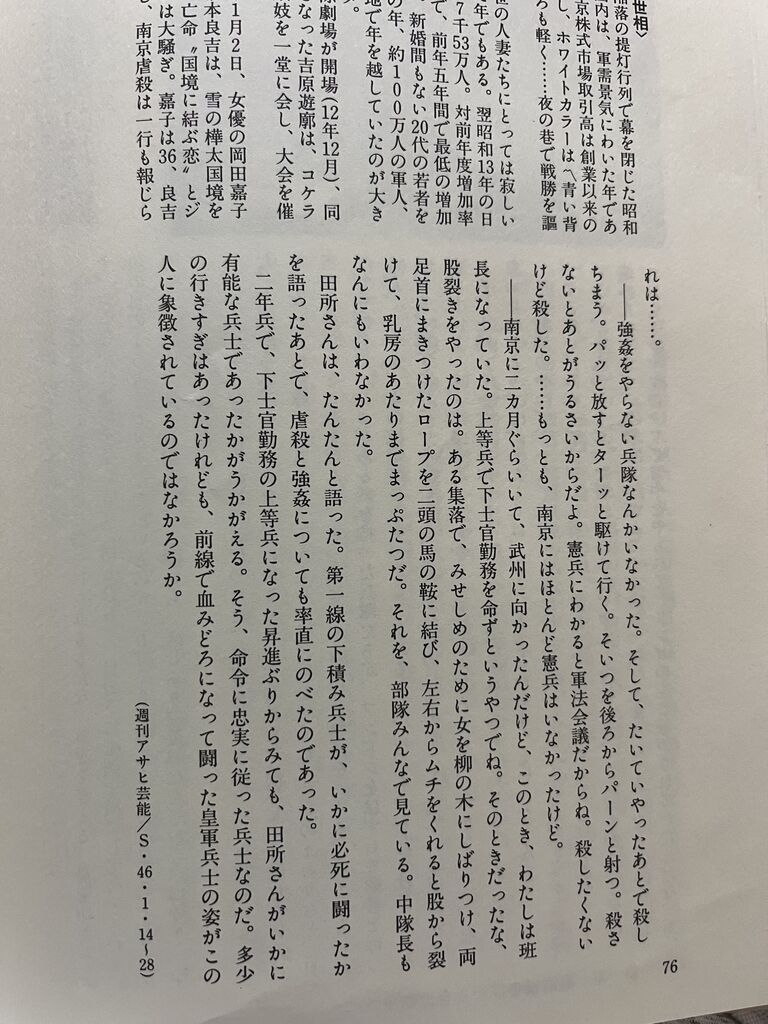 南京虐殺事件については、軍規の崩壊がよく指摘される。憲兵が全く同行していないことが、あくまでも、表面上の原因かもしれない?証言内容に誇張はあっても虚偽はないと推定される。