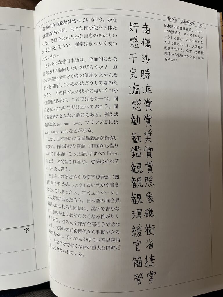 日本語には同音異義語がけた違いに多い。右に挙げた漢語(中国から借り入れて日本語になった語)はすべて「かんしょう」と発音されるが、意味はそれぞれ全く違う